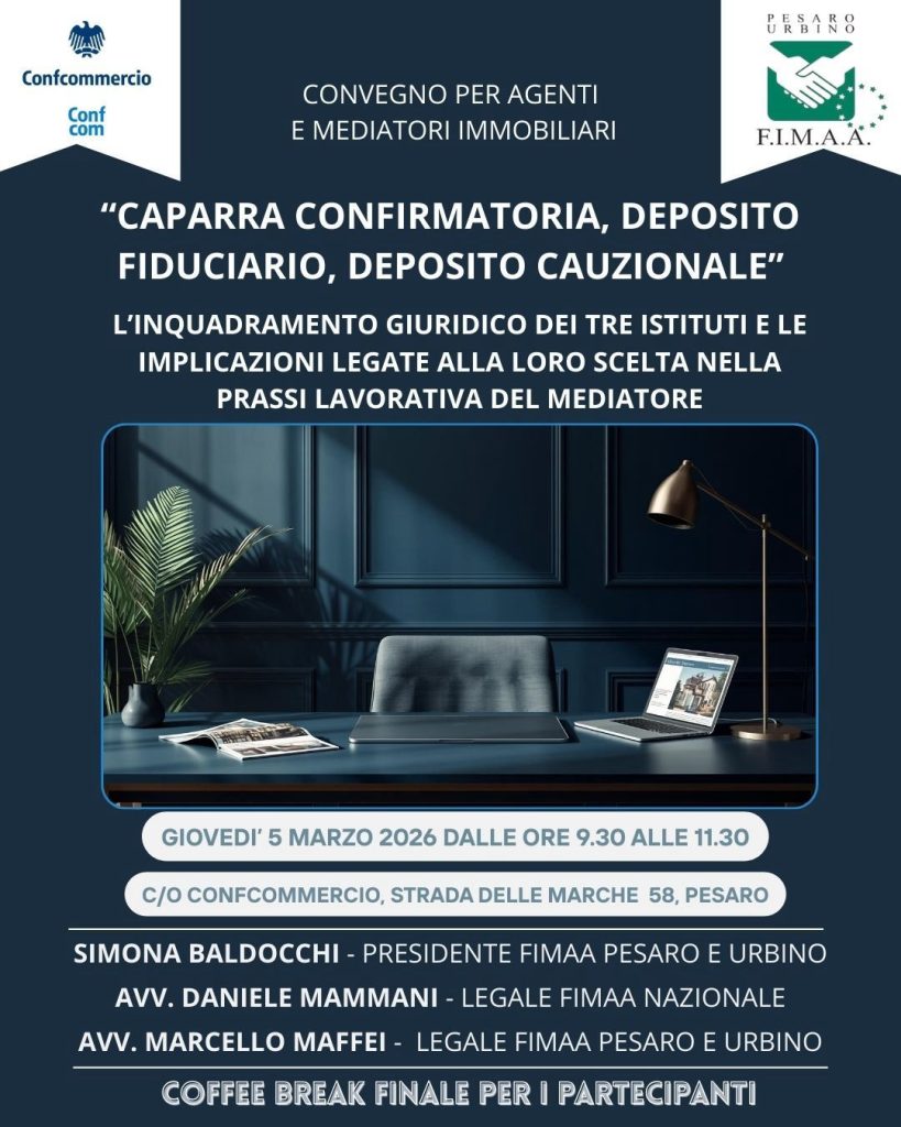 “Caparra confirmatoria, deposito fiduciario, deposito cauzionale” è il titolo del nuovo interessante convegno organizzato da Fimaa (Federazione Italiana Mediatori Agenti D’Affari) di Pesaro Urbino. E’ in programma giovedì 5 marzo alle ore 9.30...