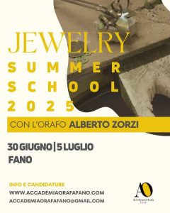 presentazione della domanda di partecipazione alla Jewelry Summer School riservata a studenti, creativi, orafi, designer e appassionati di arte orafa che si svolgerà a Fano dal 30 giugno al 5 luglio 2025. Il progetto permette una esperienza formativa immersiva nel design e nella realizzazione di un gioiello, ispirato all’opera dell’orafo di fama internazionale Alberto Zorzi, che interverrà come guest artist e supervisore della Jewelry Summer School, con l’affiancamento tecnico e laboratoriale dei docenti dell’Accademia Orafa. Il corso prevede una prima parte teorica sul gioiello, introduttiva al lavoro, seguita dallo sviluppo produttivo al banchetto orafo. Le tecniche di creazione e lavorazione di ogni gioiello saranno concordate con l’artista orafo e con i docenti di laboratorio, è possibile indicare, al momento della presentazione della domanda, le tecniche di lavorazione che si padroneggiano o che si vorrebbero utilizzare.