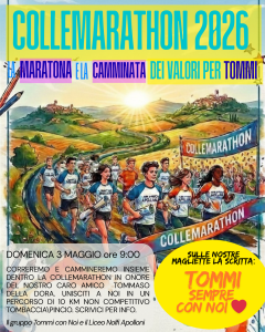 Domenica 3 maggio un gruppo di studenti e docenti del Liceo Nolfi Apolloni correrà la staffetta mentre un altro gruppo farà insieme la camminata non agonistica di 10 chilometri con partenza da Tombaccia alle ore 9:00 e arrivo al Pincio: l’adesione alla camminata è aperta, unitevi a noi, prima della partenza scriveremo sulle nostre magliette la frase “Tommi sempre con noi ❤️”.