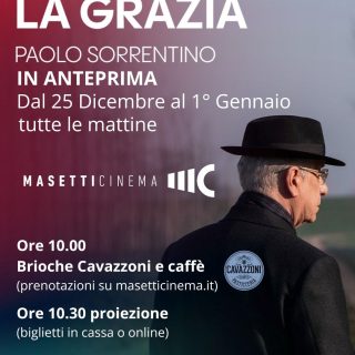 Anteprima nazionale unica sala in regione Da giovedì 25 dicembre a giovedì 1 gennaio (ore 10:30) LA GRAZIA (2025, Italia, 133’) diretto da Paolo Sorrentino Locandina numerata autografata dal regista in omaggio a tutti gli spettatori. Colazione...