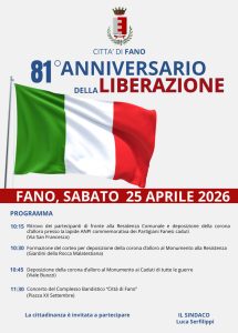 La città di Fano celebra l’81° anniversario della Liberazione con una mattinata di iniziative istituzionali dedicate al ricordo dei caduti e ai valori della democrazia. Il programma di sabato 25 aprile prenderà il via alle 10:15 con il ritrovo davanti alla Residenza comunale e la deposizione della corona d’alloro presso la lapide ANPI in via San Francesco. Seguirà la formazione del corteo verso il Monumento alla Resistenza ai Giardini della Rocca Malatestiana, per poi proseguire con la deposizione della corona al Monumento ai Caduti in viale Buozzi. La mattinata si concluderà alle 11:30 in piazza XX Settembre con il concerto del Complesso Bandistico “Città di Fano”.