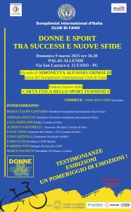 Il Soroptimist International d’Italia Club Fano è lieto di annunciare l’Evento “DONNE E SPORT TRA SUCCESSI E NUOVE SFIDE”, nell’ambito del Progetto Nazionale DONNE e SPORT, che si terrà: