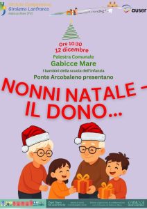 L’evento conclusivo del progetto “Nonni Natale – Il Dono” si svolgerà venerdì 12 dicembre alle ore 10.30, presso la palestra comunale e vedrà in scena i bambini della Scuola dell’Infanzia Ponte Arcobaleno dell’Istituto Comprensivo “G. Lanfranco”.