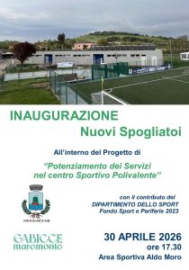 Saranno inaugurati giovedì 30 Aprile, alle ore 17.30, i nuovi spogliatoi dell’area sportiva di Via Aldo Moro, realizzati nell’ambito del progetto “Potenziamento dei Servizi nel Centro Sportivo Polivalente”, con il contributo del Dipartimento per lo Sport – Fondo Sport e Periferie 2023.