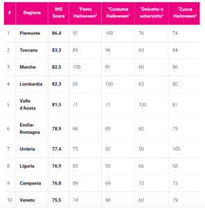 In vetta alla classifica si conferma il Piemonte, con 86,4 punti e un primato assoluto nelle ricerche per “costume Halloween” (100/100).