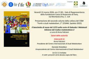 Cassa di Risparmio verrà presentato il secondo volume della collana “Fonti e studi malatestiani” dal titolo “Il banchetto di nozze del 1373 nella corte di Galeotto I Malatesti. Edizione del Codice malatestiano 2”, a cura di Anna Falcioni.