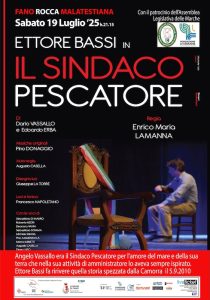 Sabato 19 Luglio 2025, ore 21.15 alla Rocca Malatestiana di Fano uno spettacolo di grande valore civico: “Il Sindaco Pescatore” con ETTORE BASSI, tratto dall’omonimo libro di Dario Vassallo. Drammaturgia di EDOARDO ERBA. Regia ENRICO MARIA LAMANNA e con la partecipazione straordinaria dei ragazzi/mimi delle Scuole di Fano.