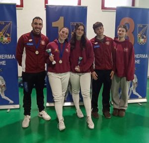 È stata una giornata trionfale per la scherma di Fano quella trascorsa al Palascherma di Ancona in occasione del Campionato Regionale Gold Assoluti, dove la Fanum Fortunae Scherma ha ottenuto il titolo regionale di sciabola sia in campo maschile che femminile confermando un percorso di crescita che non accenna a fermarsi. La prima impresa della domenica di gare sulla pedana dorica porta la firma di Angelo Marino Carmollingo, che, al suo debutto assoluto nella specialità, ha sbaragliato la concorrenza prendendosi il titolo regionale e la qualificazione ai Campionati Italiani e riportando l’oro nella città della Fortuna dopo cinque anni di attesa. L’altra grande protagonista è stata Sara Tonelli, che non solo si è laureata campionessa regionale di sciabola alla sua prima esperienza nella disciplina, ma ha brillato anche nella spada riportando a casa un argento. Insieme a lei stacca il pass per le fasi nazionali pure una determinatissima Asia Volpi, autrice di una prova di alto livello, mentre Greta Martuscello ha chiuso la sua corsa nel tabellone delle 32. La Tonelli ha peraltro fermato la corsa all’oro di entrambe, aggiudicandosi dapprima il derby con la Martuscello e successivamente in semifinale quello con la Volpi. Risposte positive per il Maestro Evelina Langella e per tutta la società fanese sono arrivate anche dalla spada maschile, con Giovanni Cavazzoni che ha sfiorato la finale a otto affiancato dalle solide prestazioni di Riccardo Ucci e dell’esordiente Yassine Gioia.
