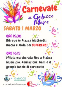 Sabato 1°marzo è in programma la grande festa di Carnevale con tanta animazione, musica e giochi. Alle ore 15.30 ritrovo in Piazza Matteotti con gli allegri truccabimbi, palloncini e la sfida dei Supereroi che saranno i protagonisti della festa.