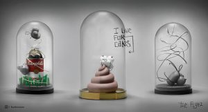 Le opere proposte, piccole sculture dal forte impatto visivo, hanno come protagoniste le mosche, soggetti tanto inaspettati quanto emblematici nella poetica dell’artista. Frank Cianuro, da sempre attratto dall’aspetto irriverente e disturbante di questi insetti, le reinterpreta oggi con una certa nostalgia, dichiarando: «Così come quando da bambino cercavo di intrappolarle sotto un bicchiere, oggi le catturo in forma artistica sotto campane di vetro unendo gioco, ironia e riflessione perché, nell’immaginario di tutti, sono orribili e fastidiose ma loro rimangono il mio modo di divertirmi con il ‘meno bello’ rendendolo oggetto di attenzione». Questa collaborazione rappresenta un importante passo nella diffusione dell’immaginario provocatorio e al tempo stesso intimo di Frank Cianuro, confermando l’interesse internazionale per la sua visione unica, audace ed irriverente.