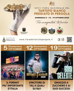“Un appuntamento che profuma di storia e di tradizione – ha evidenziato il vicesindaco e assessore ai Grandi Eventi, il deputato Antonio Baldelli – quest’anno ancora sotto lo slogan “The Unexpected Marche – Le Marche che non ti aspetti”. Un claim scelto per dare un taglio sempre più internazionale alla manifestazione. La Fiera del Tartufo è oggi uno dei Grandi Eventi di Pergola, un autentico tris d’assi insieme alla Rievocazione storica di agosto e alla Cioccovisciola di Natale. Tre perle che intrecciano sapori, storia e sensazioni, secondo il claim delle “3S”: Sapori autentici dei nostri prodotti tipici; Storia millenaria dei Bronzi dorati; Sensazioni uniche che solo le Marche sanno regalare. Il sipario si alzerà domenica 5 ottobre, per poi rinnovarsi il 12 e il 19 ottobre. Tre domeniche all’insegna della qualità, del gusto e della cultura. L’entusiasmo è palpabile, segno di una notorietà e di un livello che la nostra Fiera ha ormai consolidato. Pergola è pronta per un’altra straordinaria edizione”.