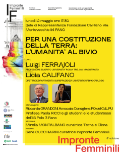 Partendo dal pensiero di Ferrajoli e dopo la sua relazione iniziale i lavori seguiranno con gl’ interventi di Licia Califano, Direttrice del Dipartimento di Giurisprudenza dell’Università di Urbino, l’avvocata Riccarda GRANDONI Consigliera Pari Opportunità del Camera del Lavoro di Pesaro e Urbino, e la Prof.ssa Paola RICCI con gli studenti e le studentesse dell’IIS Polo 3 Fano che proporranno le loro elaborazioni sul tema, presentando, tra le altre cose, un nuovo articolo della Costituzione della Terra.