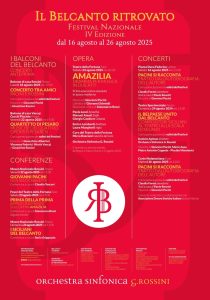 Sabato 23 agosto 2025 il Festival si sposta nel meraviglioso Teatro della Fortuna di Fano, dove alle 20.30 tornerà sulle scene, in prima esecuzione assoluta in epoca contemporanea, Amazilia, il melodramma di genere serio di Giovanni Pacini con libretto di Giovanni Schmidt (che collaborò con Rossini, Mercadante, Donizetti, Spontini). L’opera vide la luce nell’estate del 1825 al San Carlo di Napoli e annovera tra i primi interpreti vere star dell’epoca, Josephine Fodor-Mainvielle, Luigi Lablache e Giovanni David a: nel 2025 viene ripresa dal Festival grazie all’edizione critica di Gianmarco Rossi, che presenterà il suo lavoro di ricerca e la nuova edizione dell’opera lo stesso giorno in una conferenza nel foyer del teatro fanese alle ore 19.00 (a seguire, un brindisi prima della recita delle ore 20.30).