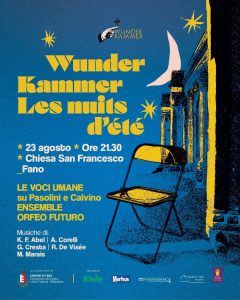 Wunderkammer “Les nuits d’été”, la rassegna musicale che illumina la Chiesa di S. Francesco di Fano, prosegue sabato 23 agosto ore 21:30 con l’Ensemble Orfeo Futuro. Nello spettacolo “Le Voci Umane – un’evocazione di parola e suono”, l’intreccio di musica antica, elettronica e parola, per dare nuova voce a due giganti della cultura italiana: Pier Paolo Pasolini e Italo Calvino.