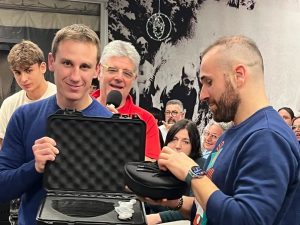 facendo un ottimo lavoro con le giovanili, lo vediamo quando convochiamo giovani che si allenano con costanza e voglia e che sul campo non sfigurano affatto contro i più grandi>. La grande famiglia del Fano Rugby intanto si è anche ritrovata a tavola per la tradizionale cena degli auguri di Natale, tenutasi al Ristorante Biricocco. Tutti presenti, dalla formazione di C1 a quella del touch rugby passando per giovanili, minirugby e Old, oltre ad alcuni degli sponsor societari. E’ stata peraltro l’occasione per consegnare all’U18 Fano/Sena la nuova maglia, realizzata grazie al supporto di ISA Infissi, Laventinove (XX9), King Sport, OF Cassetti, Punto Gomme e Ciacci Arredamenti. Il sostegno di Laventinove (XX9) ha inoltre reso possibile la dotazione della VEO, moderna telecamera per riprendere senza operatore gare ed allenamenti per poi poterli anche analizzare.