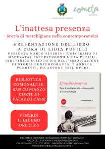 Biblioteca di San Costanzo: appuntamento alle 21.00 con la presentazione del nuovo libro L’inattesa presenza. Storie di marchigiane nella contemporaneità (Millesettecentonovantasette edizioni, 2025) curato da Lidia Pupilli, direttrice scientifica dell’Associazione di Storia Contemporanea. Presenterà la serata il professore universitario Marco Severini e interverranno Lidia Pupilli e Andrea Pongetti, co-autore dell’opera.