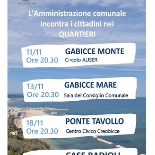 L’Amministrazione comunale di Gabicce Mare incontra i cittadini nei quartieri: il primo incontrò sarà a Gabicce Monte, martedì 11 novembre, alle ore 20.30, al Circolo Auser. A seguire il quartiere di Gabicce Mare,...
