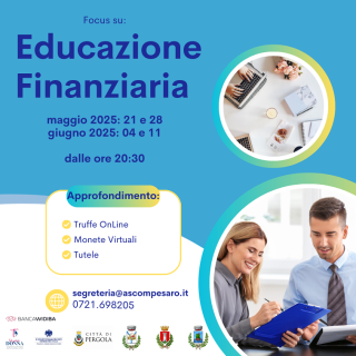 Terziario Donna con Confcommercio Marche Nord e la collaborazione di Banca Widiba e delle amministrazioni comunali coinvolte organizza un corso di ‘Educazione finanziaria’ per approfondire tematiche di strettissima attualità, in particolare le truffe...